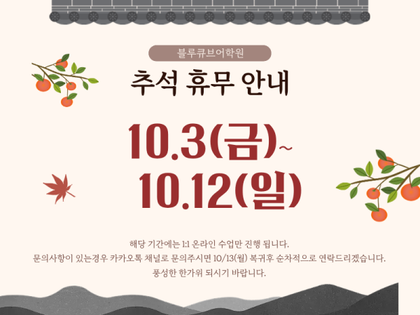 연휴기간 문의는 카카오톡 채널로 남겨주시면 10/13 (월) 업무 복귀 후 순차적으로 연락드리겠습니다.